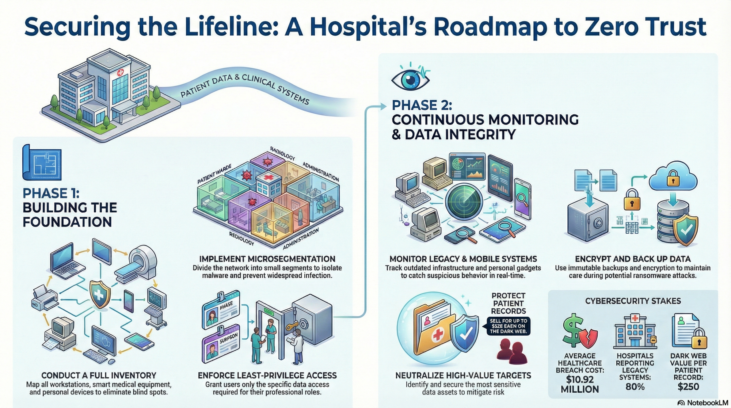 Here’s a roadmap for hospitals to adopt zero-trust measures. Each step helps strengthen security while supporting the critical work healthcare teams do every day.