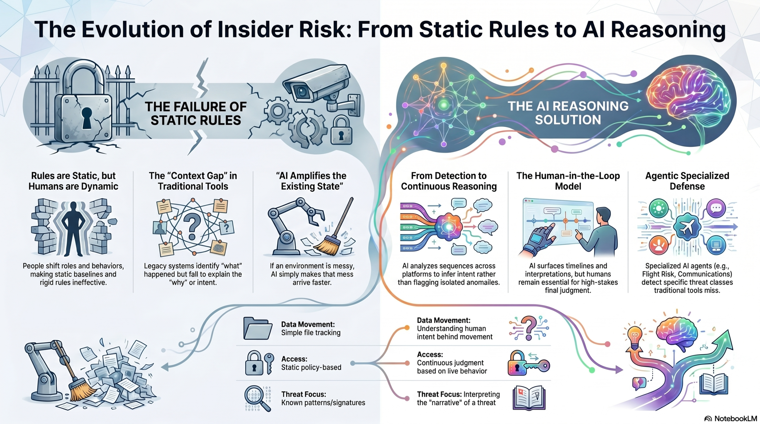 A major theme of the episode is insider threat and why it remains such a stubborn challenge for security teams. Aviv explains that most security technologies are built around software-based environments that are relatively predictable and can be mapped, modeled, and controlled. Humans are different. People shift roles, adapt to pressure, behave differently depending on circumstances, and cannot be reduced to static baselines or simple rules for long. That is why, he says, insider risk is fundamentally a reasoning problem rather than a rules problem. Instead of asking only whether a user performed a suspicious action, effective security systems now need to ask why that action happened in that moment, under those conditions, and in that broader context.