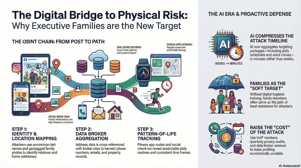 The uncomfortable truth for security teams is that digital exposure and physical risk are no longer separate problems. They feed each other. And the place where they converge most dangerously is the executive’s family.